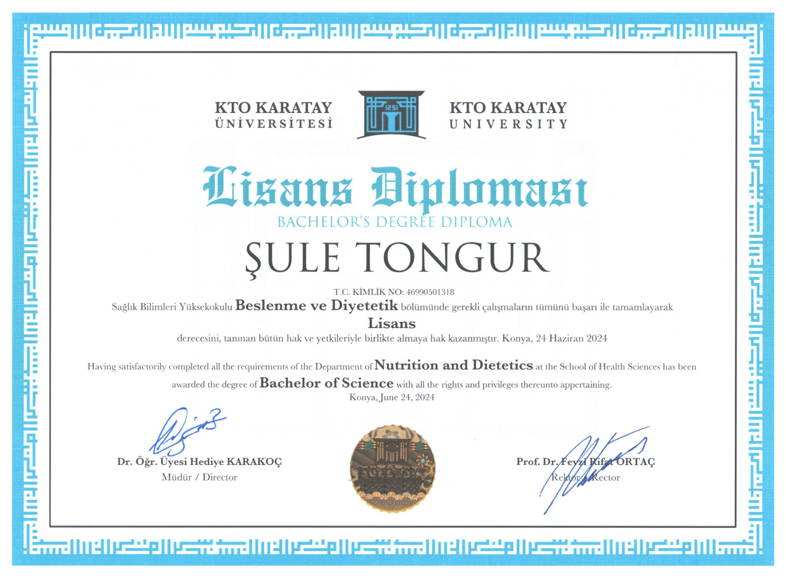 Diyetisyen Şule Tongur, 2024 yılında KTO Karatay Üniversitesi Beslenme ve Diyetetik Bölümü’nden mezun olmuştur. Lisans eğitimi süresince beslenmenin yalnızca kilo yönetimi değil, aynı zamanda hastalıkların önlenmesi ve yaşam kalitesinin artırılmasında güçlü bir terapi aracı olduğu anlayışıyla eğitimini sürdürmüştür.